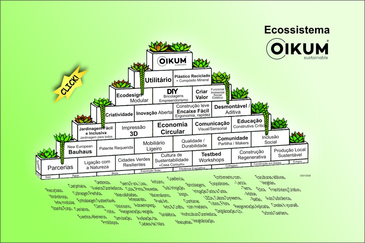 O Conceito Oikum é o referencial de valores coerentes que sustentam a marca Oikum, destacando-se a Economia Circular. No gráfico que se segue, o Ecossistema Oikum, cada bloco representa um desses valores. Entretanto, novos valores e aplicações aguardam a sua vez para integrarem o sistema…