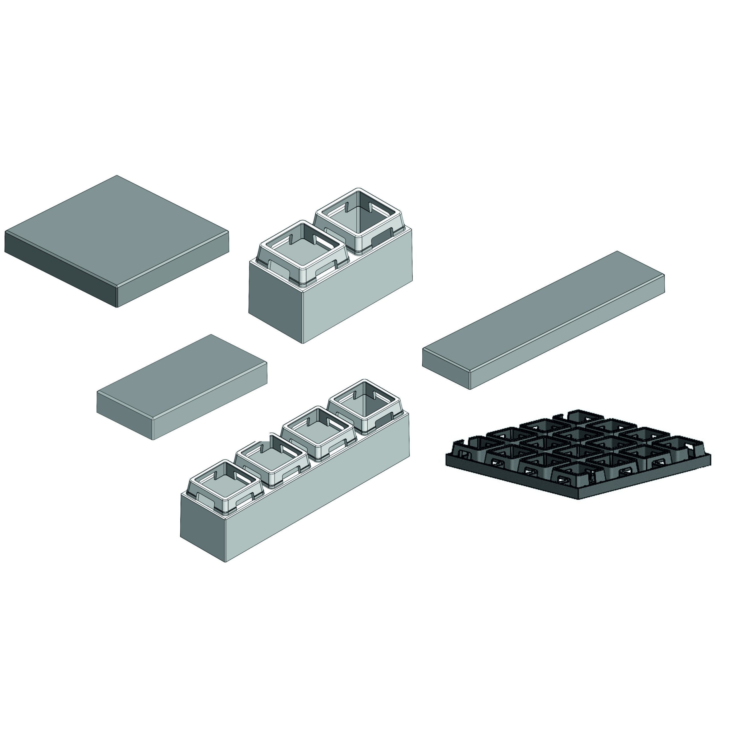 Contéudo: Caixa Reutilizável com 8 blocos BX 02 4.2 + 7 tampas BT 01 4.2 + 2 tampas BT 01 2.2 + 2 Grelha OIKUM.